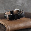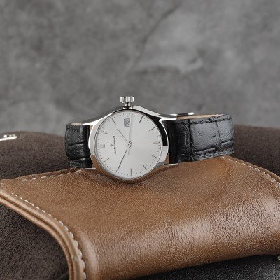 Diese Claude Bernard Uhr hat ein Edelstahl Gehäuse mit einem Durchmesser von 28 mm und ist mit einem Armband aus Leder versehen. In der Uhr arbeitet ein Ronda Uhrwerk. Das Glas der Uhr besteht aus Sapphir - Glas.