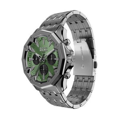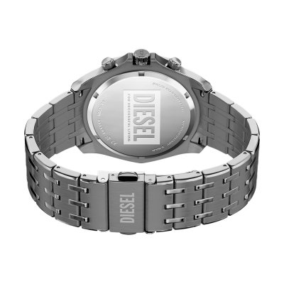 Diese Diesel Uhr hat ein Edelstahl Gehäuse mit einem Durchmesser von 46 mm und ist mit einem Armband aus Edelstahl versehen. In der Uhr arbeitet ein Seiko Instruments Inc. Uhrwerk. Das Glas der Uhr besteht aus Mineral - Glas.
