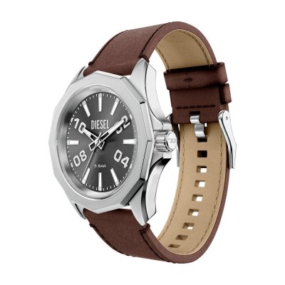 Diese Diesel Uhr hat ein Edelstahl Gehäuse mit einem Durchmesser von 44 mm und ist mit einem Armband aus Leder versehen. In der Uhr arbeitet ein Miyota Uhrwerk. Das Glas der Uhr besteht aus Mineral - Glas.