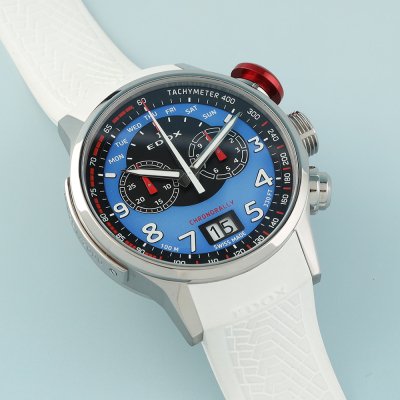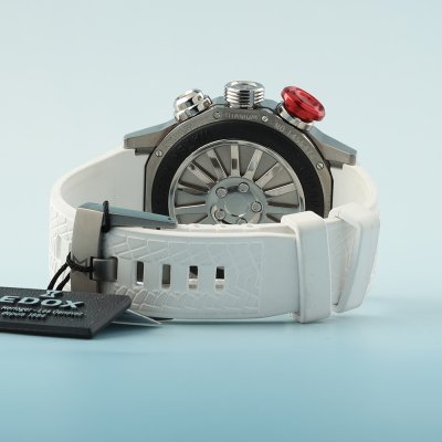 Diese Edox Uhr hat ein Titan Gehäuse mit einem Durchmesser von 48 mm und ist mit einem Armband aus Kautschuk versehen. In der Uhr arbeitet ein Ronda Uhrwerk. Das Glas der Uhr besteht aus Sapphir - Glas.
