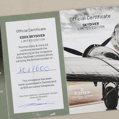 Diese Edox Uhr hat ein Edelstahl Gehäuse mit einem Durchmesser von 42 mm und ist mit einem Armband aus Leder versehen. In der Uhr arbeitet ein Sellita Uhrwerk. Das Glas der Uhr besteht aus Sapphir - Glas.