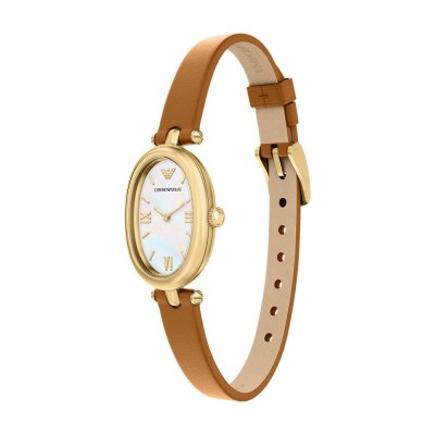 Diese Emporio Armani Uhr hat ein Edelstahl Gehäuse mit einem Durchmesser von 28 mm und ist mit einem Armband aus Leder versehen. In der Uhr arbeitet ein Seiko Uhrwerk. Das Glas der Uhr besteht aus Mineral - Glas.