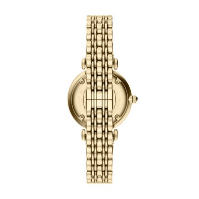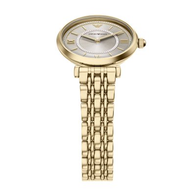 Diese Emporio Armani Uhr hat ein Edelstahl Gehäuse mit einem Durchmesser von 32 mm und ist mit einem Armband aus Edelstahl versehen. In der Uhr arbeitet ein Seiko Instruments Inc. Uhrwerk. Das Glas der Uhr besteht aus Mineral - Glas.
