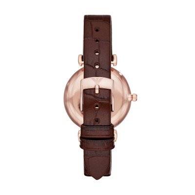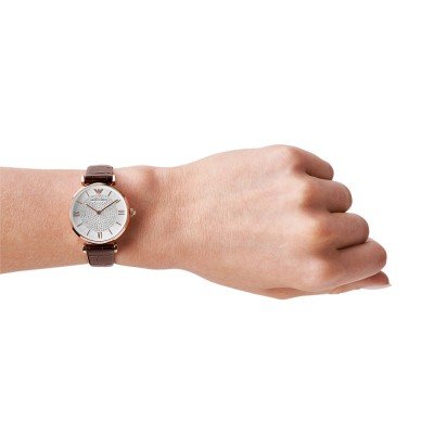 Diese Emporio Armani Uhr hat ein Edelstahl Gehäuse mit einem Durchmesser von 32 mm und ist mit einem Armband aus Leder versehen. In der Uhr arbeitet ein Miyota Uhrwerk. Das Glas der Uhr besteht aus Mineral - Glas.