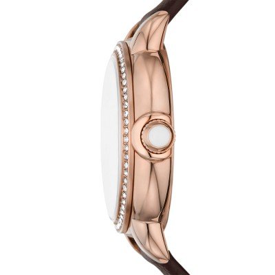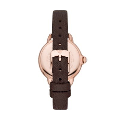 Diese Emporio Armani Uhr hat ein Edelstahl Gehäuse mit einem Durchmesser von 32 mm und ist mit einem Armband aus Leder versehen. In der Uhr arbeitet ein Miyota Uhrwerk. Das Glas der Uhr besteht aus Mineral - Glas.