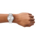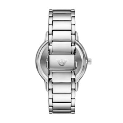 Diese Emporio Armani Uhr hat ein Edelstahl Gehäuse mit einem Durchmesser von 43 mm und ist mit einem Armband aus Edelstahl versehen. In der Uhr arbeitet ein Seiko Instruments Inc. Uhrwerk. Das Glas der Uhr besteht aus Mineral - Glas.