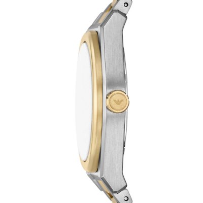 Diese Emporio Armani Uhr hat ein Edelstahl Gehäuse mit einem Durchmesser von 41 mm und ist mit einem Armband aus Edelstahl versehen. In der Uhr arbeitet ein Miyota Uhrwerk. Das Glas der Uhr besteht aus Mineral - Glas.