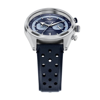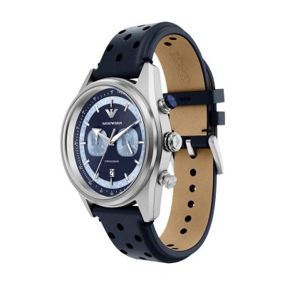 Diese Emporio Armani Uhr hat ein Edelstahl Gehäuse mit einem Durchmesser von 42 mm und ist mit einem Armband aus Leder versehen. In der Uhr arbeitet ein Miyota Uhrwerk. Das Glas der Uhr besteht aus Mineral - Glas.
