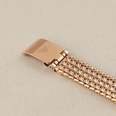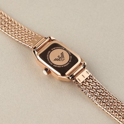 Diese Emporio Armani Uhr hat ein Edelstahl Gehäuse mit einem Durchmesser von 16 mm und ist mit einem Armband aus Edelstahl versehen. In der Uhr arbeitet ein Seiko Uhrwerk. Das Glas der Uhr besteht aus Mineral - Glas.