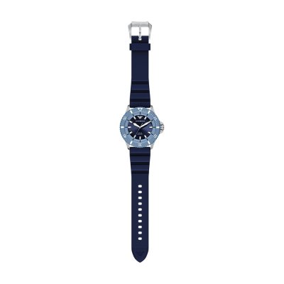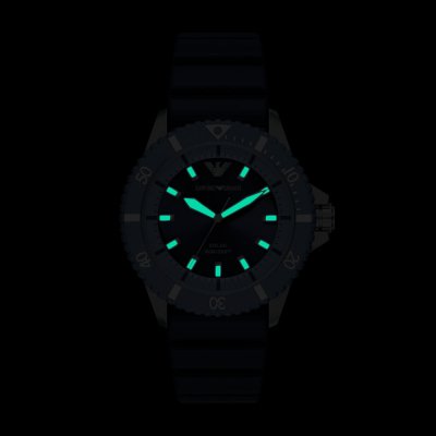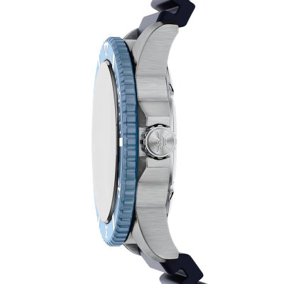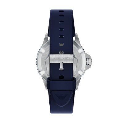 Diese Emporio Armani Uhr hat ein Edelstahl Gehäuse mit einem Durchmesser von 42 mm und ist mit einem Armband aus Kautschuk versehen. In der Uhr arbeitet ein Miyota Uhrwerk. Das Glas der Uhr besteht aus Mineral - Glas.