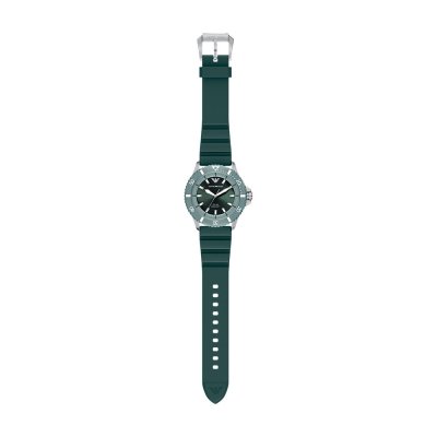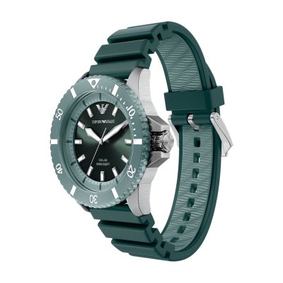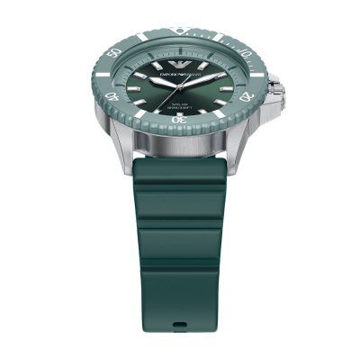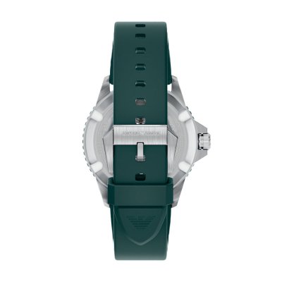 Diese Emporio Armani Uhr hat ein Edelstahl Gehäuse mit einem Durchmesser von 42 mm und ist mit einem Armband aus Kautschuk versehen. In der Uhr arbeitet ein Miyota Uhrwerk. Das Glas der Uhr besteht aus Mineral - Glas.