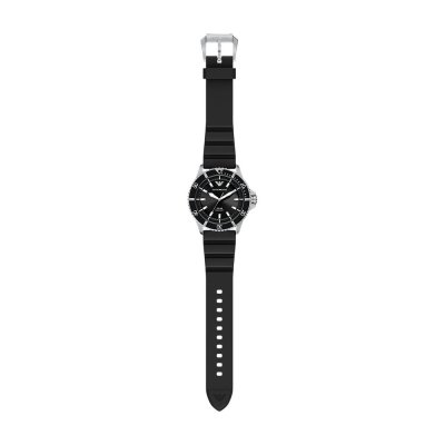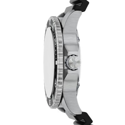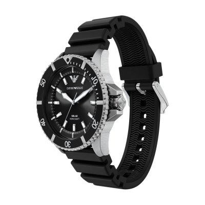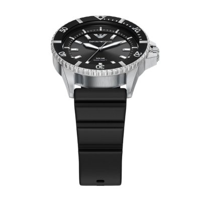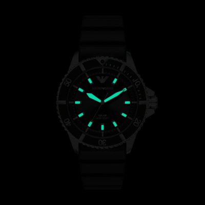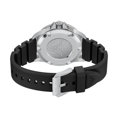 Diese Emporio Armani Uhr hat ein Edelstahl Gehäuse mit einem Durchmesser von 42 mm und ist mit einem Armband aus Kautschuk versehen. In der Uhr arbeitet ein Miyota Uhrwerk. Das Glas der Uhr besteht aus Mineral - Glas.
