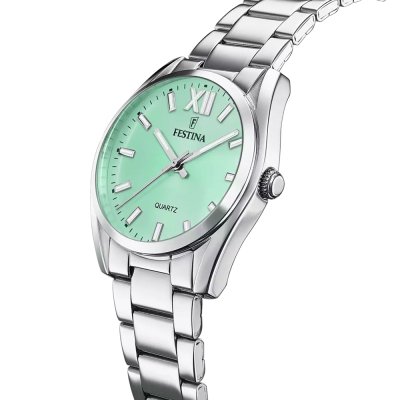 Diese Festina Uhr hat ein Edelstahl Gehäuse mit einem Durchmesser von 36 mm und ist mit einem Armband aus Edelstahl versehen. In der Uhr arbeitet ein Miyota Uhrwerk. Das Glas der Uhr besteht aus Mineral - Glas.
