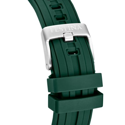 Diese Festina Uhr hat ein Edelstahl Gehäuse mit einem Durchmesser von 46 mm und ist mit einem Armband aus Kautschuk versehen. In der Uhr arbeitet ein Miyota Uhrwerk. Das Glas der Uhr besteht aus Mineral - Glas.