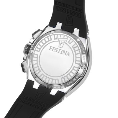 Diese Festina Uhr hat ein Edelstahl Gehäuse mit einem Durchmesser von 46 mm und ist mit einem Armband aus Kautschuk versehen. In der Uhr arbeitet ein Miyota Uhrwerk. Das Glas der Uhr besteht aus Mineral - Glas.