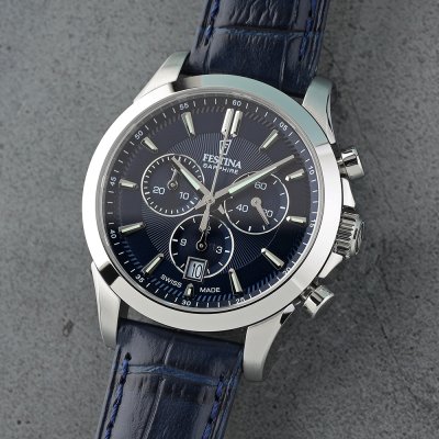 Diese Festina Uhr hat ein Edelstahl Gehäuse mit einem Durchmesser von 39 mm und ist mit einem Armband aus Leder versehen. In der Uhr arbeitet ein Ronda Uhrwerk. Das Glas der Uhr besteht aus Sapphir - Glas.