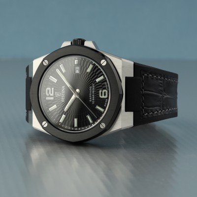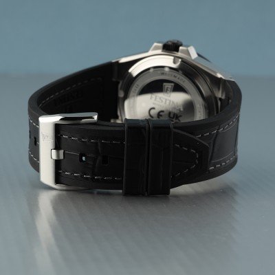 Diese Festina Uhr hat ein Edelstahl Gehäuse mit einem Durchmesser von 42 mm und ist mit einem Armband aus Kautschuk versehen. In der Uhr arbeitet ein Ronda Uhrwerk. Das Glas der Uhr besteht aus Sapphir - Glas.