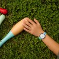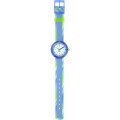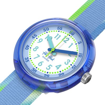 Diese Flik Flak Uhr hat ein Bio-Kunststoff Gehäuse mit einem Durchmesser von 30 mm und ist mit einem Armband aus Textil versehen. In der Uhr arbeitet ein ETA Uhrwerk. Das Glas der Uhr besteht aus Acryl - Glas.