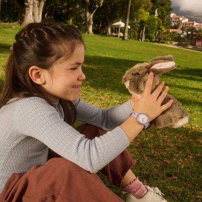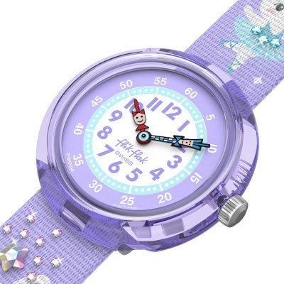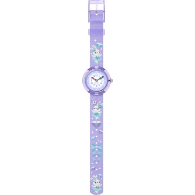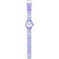 Diese Flik Flak Uhr hat ein Bio-Kunststoff Gehäuse mit einem Durchmesser von 30 mm und ist mit einem Armband aus Textil versehen. In der Uhr arbeitet ein ETA Uhrwerk. Das Glas der Uhr besteht aus Acryl - Glas.