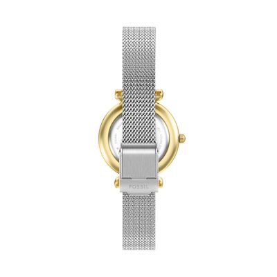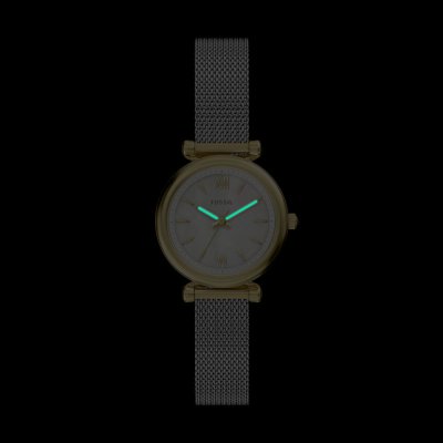 Diese Fossil Uhr hat ein Edelstahl Gehäuse mit einem Durchmesser von 28 mm und ist mit einem Armband aus Edelstahl versehen. In der Uhr arbeitet ein Seiko Instruments Inc. Uhrwerk. Das Glas der Uhr besteht aus Mineral - Glas.