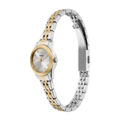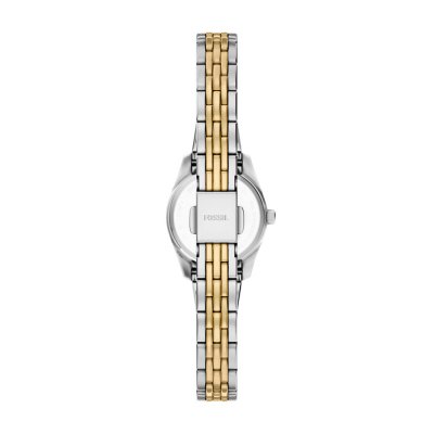 Diese Fossil Uhr hat ein Edelstahl Gehäuse mit einem Durchmesser von 20 mm und ist mit einem Armband aus Edelstahl versehen. In der Uhr arbeitet ein Seiko Instruments Inc. Uhrwerk. Das Glas der Uhr besteht aus Mineral - Glas.