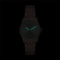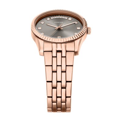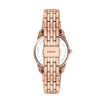 Diese Fossil Uhr hat ein Edelstahl Gehäuse mit einem Durchmesser von 34 mm und ist mit einem Armband aus Edelstahl versehen. In der Uhr arbeitet ein Seiko Instruments Inc. Uhrwerk. Das Glas der Uhr besteht aus Mineral - Glas.