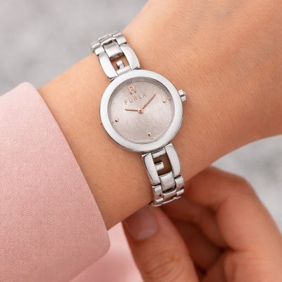 Diese Furla Uhr hat ein Edelstahl Gehäuse mit einem Durchmesser von 24 mm und ist mit einem Armband aus Edelstahl versehen. In der Uhr arbeitet ein Miyota Uhrwerk. Das Glas der Uhr besteht aus Mineral - Glas.