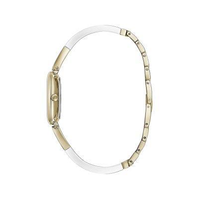 Diese Furla Uhr hat ein Edelstahl Gehäuse mit einem Durchmesser von 28 mm und ist mit einem Armband aus Edelstahl und Kunststoff versehen.
