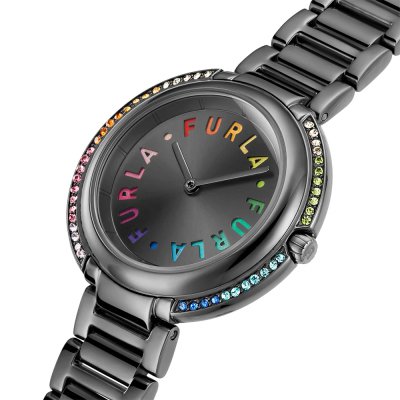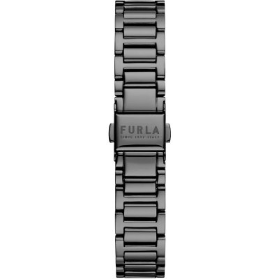 Diese Furla Uhr hat ein Edelstahl Gehäuse mit einem Durchmesser von 38 mm und ist mit einem Armband aus Edelstahl versehen.