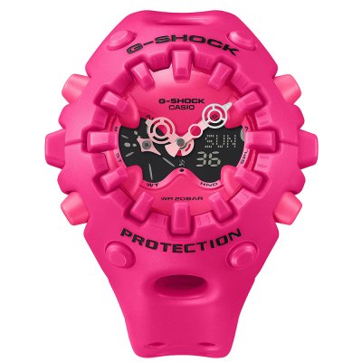 Manchmal denkt man, dass es im 21. Jahrhundert nichts mehr an Uhren zu verbessern gibt, aber dann hat man nicht auf G-Shock geachtet. Nach vierzig Jahren ständiger Innovation ist es der Marke wieder einmal gelungen, die Uhrenwelt mit einem völlig einzigartigen und originellen Design zu revolutionieren. Mit einem völlig neuen Ansatz bei Konstruktion und Design hat die GA-V01 nicht nur ein spektakuläres Aussehen, sondern ist auch äußerst stoßfest und birgt bemerkenswerte technische Innovationen: Die Gehäusekonstruktion, die das Uhrwerk schützt, nutzt eine integrierte Lünetten- und Armbandkonstruktion, die das Glas teilweise überlappt und somit auch als Stoßdämpfer fungiert, um Stöße zu absorbieren. Casio hat auch eine neue magnetische Zeigerkonstruktion entwickelt, bei der die Zeiger, die normalerweise anfällig für Stöße sind, nicht an der Achse befestigt sind, sondern durch Magnetkraft gehalten werden. Dadurch können sie Stöße effektiv absorbieren und ableiten. Diese neue Technologie ermöglicht auch die Herstellung größerer, einzigartig geformter Zeiger, da die Achse ihr Gewicht nicht tragen muss. Nach einem Stoß oder einer Erschütterung können die Zeiger vorübergehend aus ihrer Position geraten, aber innerhalb weniger Minuten kehren sie auf fast magische Weise in ihre ursprüngliche Position zurück. Das analog-digitale Zifferblatt ist mehrschichtig aufgebaut und besteht aus einem Metallzifferblatt mit Gitterelementen, die dekorative Einblicke ins Innere gewähren, und einem LCD-Display. Diese Uhr ist nichts für Risikoscheue. Sie ist auffällig, groß und sorgt garantiert für Gesprächsstoff! Und Sie können sich darauf verlassen, dass das robuste und leistungsstarke Uhrwerk trotz aller Stöße und Erschütterungen immer funktioniert!