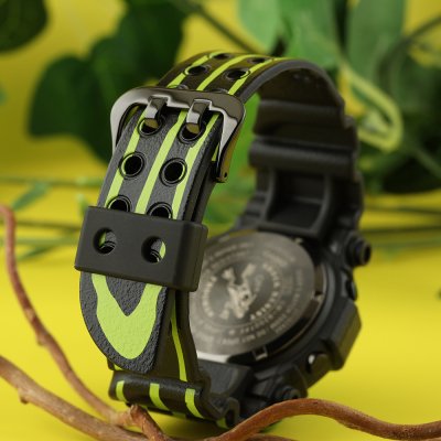 Diese G-Shock Uhr hat ein Titan Gehäuse mit einem Durchmesser von 50 mm und ist mit einem Armband aus Bio-Kunststoff versehen. In der Uhr arbeitet ein Casio Uhrwerk. Das Glas der Uhr besteht aus Mineral - Glas.
