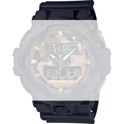Dieses G-Shock Uhrarmband ist aus kunstharz gefertigt und wird mit druckstifte an der Uhr befestigt. Das Band hat eine Breite von 29 mm und wird mit einer dornschließe geschlossen. Das Uhrenarmband hat keine gerade Halterung, was bedeutet, dass dieses Band nur für die unten aufgeführten Uhren geeignet ist.