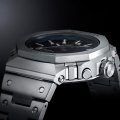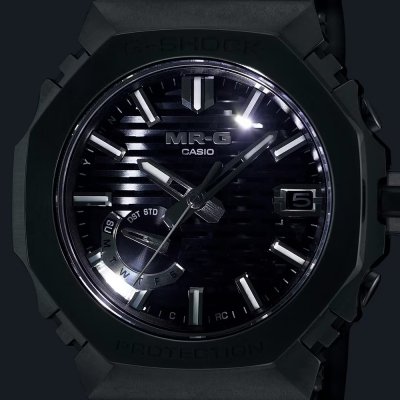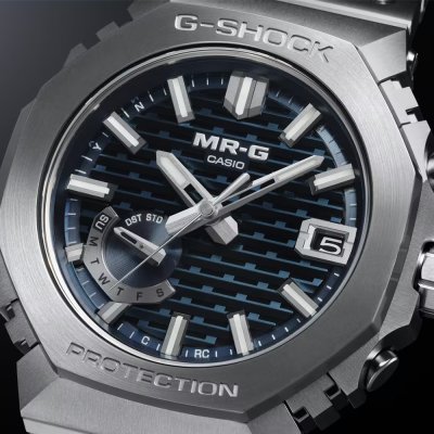 Das Zifferblatt der MRG-B2100 sieht auf den ersten Blick aus wie ein einfaches, dunkles Zifferblatt mit Textur, aber in Wirklichkeit hat es eine 3D-Textur, die auf einer japanischen Holzbearbeitungsmethode namens Kigumi basiert. Bei dieser Technik werden Holzteile ohne Metallbefestigung ineinander gesteckt. Eine scheinbar einfache Konstruktion mit raffinierten Verbindungen, die etwas ganz Besonderes schafft. Das Gleiche gilt für die MRG-B2100: Neben dem wunderschön gearbeiteten Zifferblatt ist die Uhr eine Studie der Handwerkskunst und der Kombination innovativer Materialien. In der Premium Production Line von Casio in Yamagata werden das Gehäuse und die (27 einzelnen!) Lünettenkomponenten aus der superharten Titanlegierung Ti64 gefertigt. Der Lünettenaufsatz besteht aus COBARION, einer Legierung, die viermal härter ist als reines Titan, und das Armband aus einer weiteren speziellen Titanlegierung, DAT55G, die sowohl extrem hart als auch sehr gut bearbeitbar ist. Mit einer Gehäusegröße von 44,4 × 49,5 × 13,6 mm ist sie eine G-Shock von durchschnittlicher Größe und dennoch perfekt tragbar, vor allem dank der leichten Materialien, während die Multi-Guard-Konstruktion von Gehäuse und Lünette die Uhr besonders stoßfest macht. Alle Teile der Uhr sind mit einer diamantähnlichen Kohlenstoffbeschichtung (DLC) versehen, um die Kratzfestigkeit zu erhöhen. Gesteuert wird die Uhr über das Casio-Modul 5718, das neben der funkgesteuerten Multiband 6-Zeiteinstellung auch die Smartphone-Kopplung über Bluetooth ermöglicht. Weitere Funktionen sind ein automatischer Kalender bis 2099, ein Batteriewarnsystem und eine Super Illuminator LED. Weitere App-Funktionen sind die automatische Umstellung auf Sommerzeit (DST), automatische und One-Touch-Zeitkorrektur, Telefonfinder, Handausrichtungskorrektur und Time & Place Log.