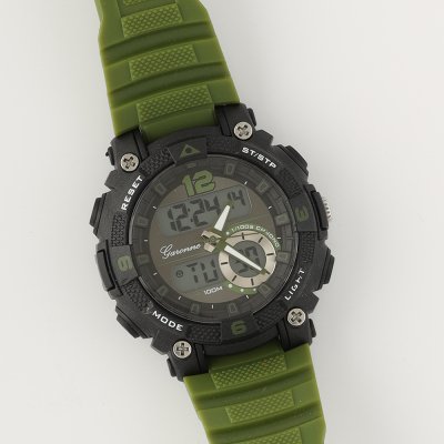 Diese Garonne Kids Uhr hat ein Kunststoff / Harz Gehäuse mit einem Durchmesser von 38 mm und ist mit einem Armband aus Kunststoff / Harz versehen. In der Uhr arbeitet ein CN Uhrwerk. Das Glas der Uhr besteht aus Acryl - Glas.