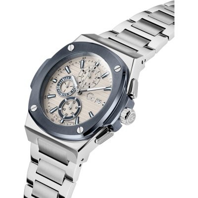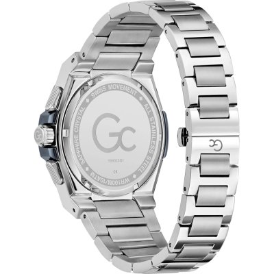 Diese GC Uhr hat ein Edelstahl Gehäuse mit einem Durchmesser von 44 mm und ist mit einem Armband aus Edelstahl versehen. In der Uhr arbeitet ein Ronda Uhrwerk. Das Glas der Uhr besteht aus Saphirbeschichtetes Mineralglas - Glas.