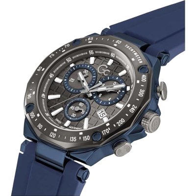 Diese GC Uhr hat ein Edelstahl Gehäuse mit einem Durchmesser von 45 mm und ist mit einem Armband aus Kautschuk versehen. In der Uhr arbeitet ein Ronda Uhrwerk. Das Glas der Uhr besteht aus Saphirbeschichtetes Mineralglas - Glas.