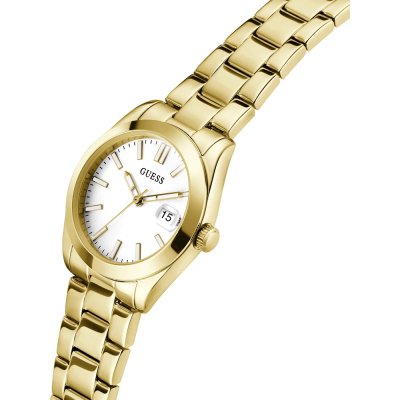 Diese Guess Uhr hat ein Edelstahl Gehäuse mit einem Durchmesser von 32 mm und ist mit einem Armband aus Edelstahl versehen. In der Uhr arbeitet ein Seiko Instruments Inc. Uhrwerk. Das Glas der Uhr besteht aus Mineral - Glas.