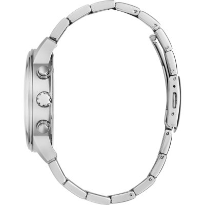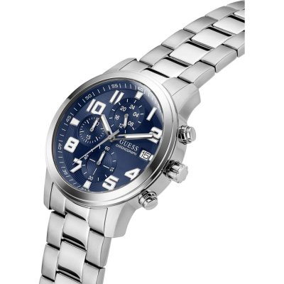 Diese Guess Uhr hat ein Edelstahl Gehäuse mit einem Durchmesser von 44 mm und ist mit einem Armband aus Edelstahl versehen. In der Uhr arbeitet ein Seiko Instruments Inc. Uhrwerk. Das Glas der Uhr besteht aus Mineral - Glas.