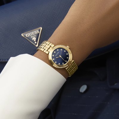 Diese Guess Uhr hat ein Edelstahl Gehäuse mit einem Durchmesser von 28 mm und ist mit einem Armband aus Edelstahl versehen. In der Uhr arbeitet ein Seiko Uhrwerk. Das Glas der Uhr besteht aus Mineral - Glas.