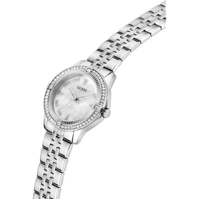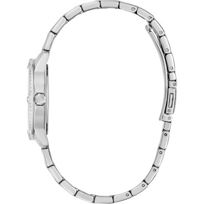 Diese Guess Uhr hat ein Edelstahl Gehäuse mit einem Durchmesser von 32 mm und ist mit einem Armband aus Edelstahl versehen. In der Uhr arbeitet ein Seiko Uhrwerk. Das Glas der Uhr besteht aus Mineral - Glas.