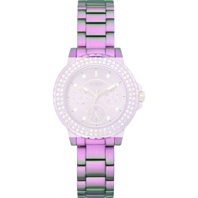 Dieses Guess Uhrarmband ist aus metall gefertigt und wird mit druckstifte an der Uhr befestigt. Das Band hat eine Breite von 16 mm und wird mit einer faltschließe mit Druckknöpfen geschlossen. Das Uhrenarmband hat keine gerade Halterung, was bedeutet, dass dieses Band nur für die unten aufgeführten Uhren geeignet ist.