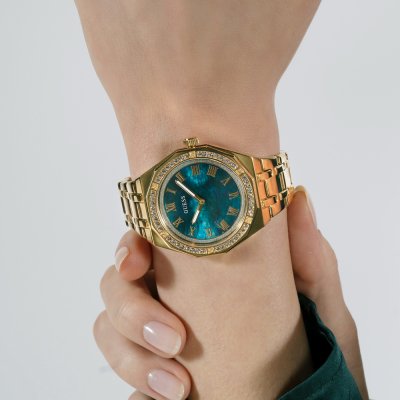 Diese Guess Uhr hat ein Edelstahl Gehäuse mit einem Durchmesser von 36 mm und ist mit einem Armband aus Edelstahl versehen. In der Uhr arbeitet ein Seiko Instruments Inc. Uhrwerk. Das Glas der Uhr besteht aus Mineral - Glas.