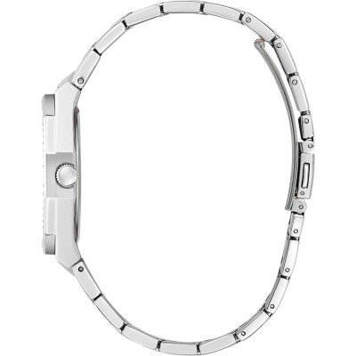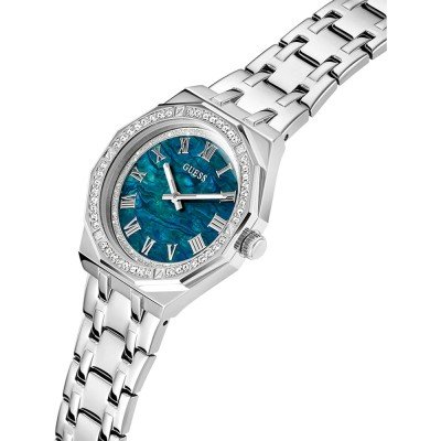 Diese Guess Uhr hat ein Edelstahl Gehäuse mit einem Durchmesser von 36 mm und ist mit einem Armband aus Edelstahl versehen. In der Uhr arbeitet ein Seiko Instruments Inc. Uhrwerk. Das Glas der Uhr besteht aus Mineral - Glas.