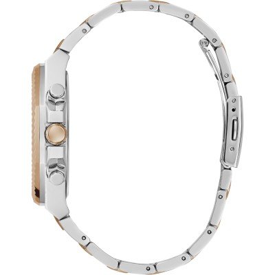 Diese Guess Uhr hat ein Edelstahl Gehäuse mit einem Durchmesser von 44 mm und ist mit einem Armband aus Edelstahl versehen. In der Uhr arbeitet ein Seiko Instruments Inc. Uhrwerk. Das Glas der Uhr besteht aus Mineral - Glas.