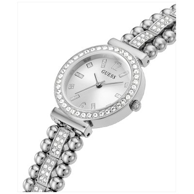 Diese Guess Uhr hat ein Edelstahl Gehäuse mit einem Durchmesser von 30 mm und ist mit einem Armband aus Edelstahl versehen. In der Uhr arbeitet ein Seiko Uhrwerk. Das Glas der Uhr besteht aus Mineral - Glas.