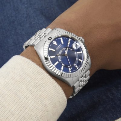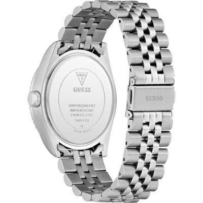 Diese Guess Uhr hat ein Edelstahl Gehäuse mit einem Durchmesser von 42 mm und ist mit einem Armband aus Edelstahl versehen. In der Uhr arbeitet ein Seiko Instruments Inc. Uhrwerk. Das Glas der Uhr besteht aus Mineral - Glas.