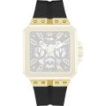 Dieses Guess Uhrarmband ist aus silikon/Kautschuk gefertigt und wird mit druckstifte an der Uhr befestigt. Das Band hat eine Breite von 28 mm und wird mit einer dornschließe geschlossen. Das Uhrenarmband hat keine gerade Halterung, was bedeutet, dass dieses Band nur für die unten aufgeführten Uhren geeignet ist.