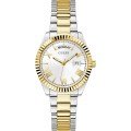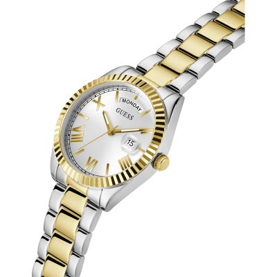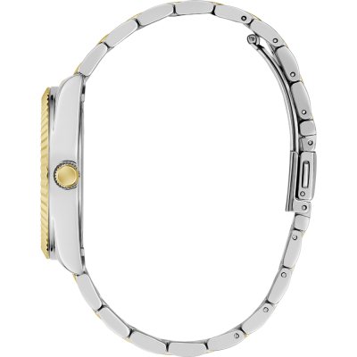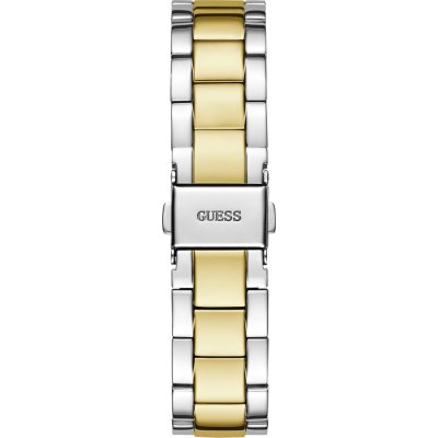 Diese Guess Uhr hat ein Edelstahl Gehäuse mit einem Durchmesser von 36 mm und ist mit einem Armband aus Metall versehen.