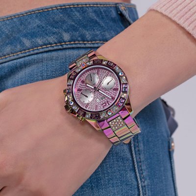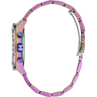 Diese Guess Uhr hat ein Edelstahl Gehäuse mit einem Durchmesser von 40 mm und ist mit einem Armband aus Edelstahl versehen.
