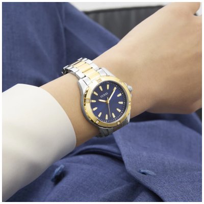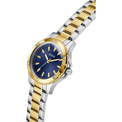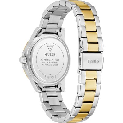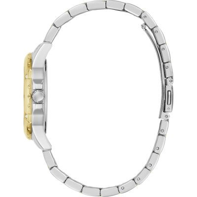 Diese Guess Uhr hat ein Edelstahl Gehäuse mit einem Durchmesser von 35 mm und ist mit einem Armband aus Edelstahl versehen. In der Uhr arbeitet ein Seiko Uhrwerk. Das Glas der Uhr besteht aus Mineral - Glas.